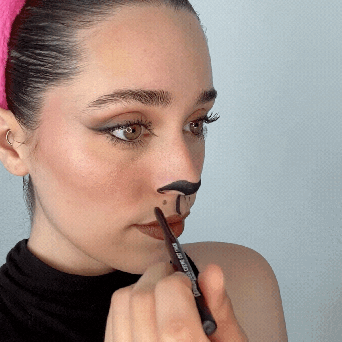 Winged eyes and drawn-on whiskers bring instant cattitude, while a blotted lip and soft blush add just enough glam.